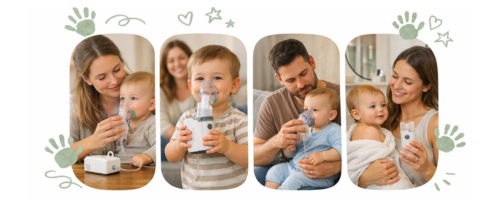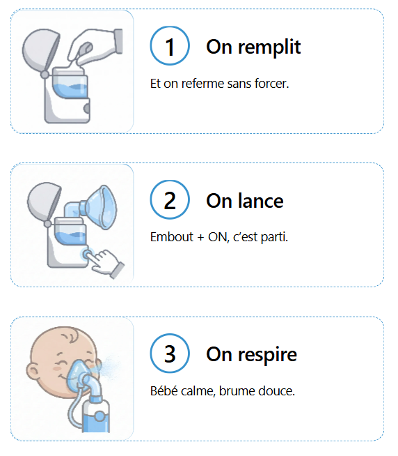 Dès 1 mois, sur avis d’un professionnel de santé et avec le masque bébé. Beaucoup de familles l’emploient ensuite ponctuellement (2–3 min) pour apporter du confort, toujours sous la surveillance d’un adulte.